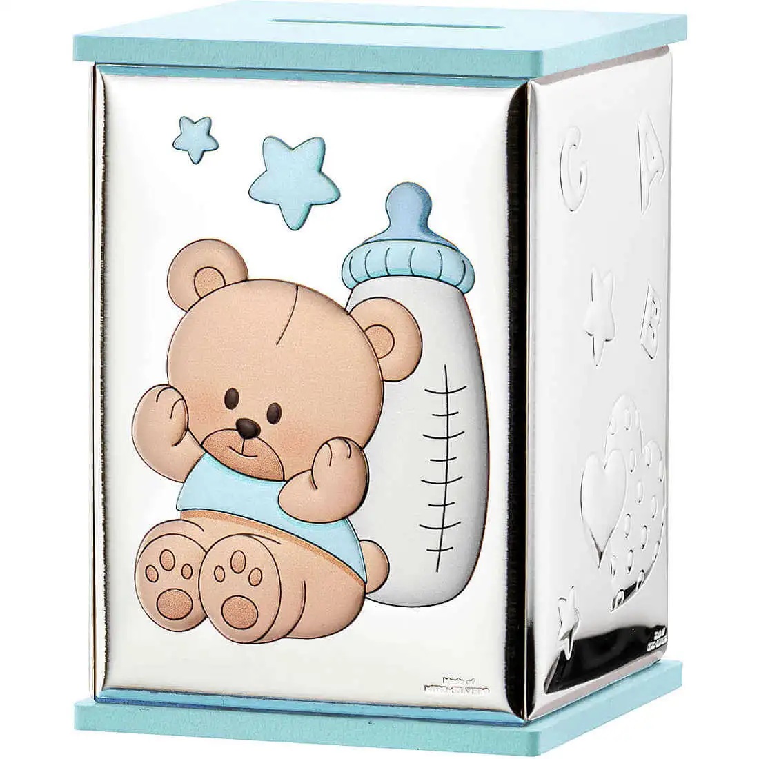 Salvadanaio in legno celeste con lastra laminata argento, soggetto orsetto. Dimensioni: 8 x 8 x 11,5 cm.