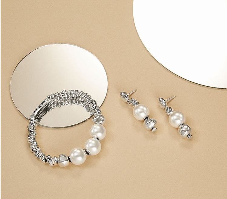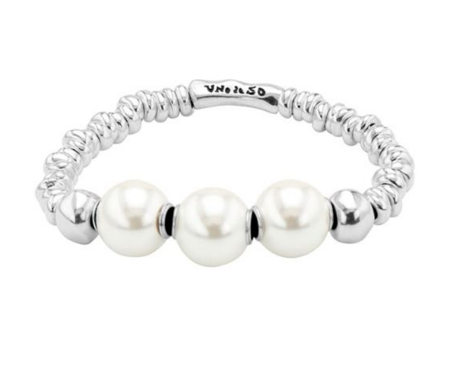 Bracciale realizzato in lega argentata e composto da maglie a pepite lucide sfaccettate ccon tre perle come elemento centrale e placchetta con logo Unode50