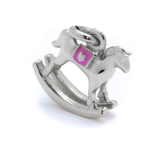 Charm cavallino a dondolo in acciaio con smalto rosa, moschettone per un facile aggancio.