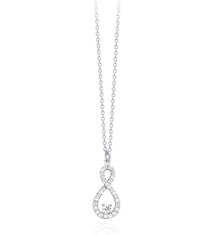 Collana in Argento 925/°°° con con pendente a infinito in zirconi e punto luce in zircone al centro. Catena lunghezza regolabile da 40 fino a cm 45 con chiusura a moschettone.