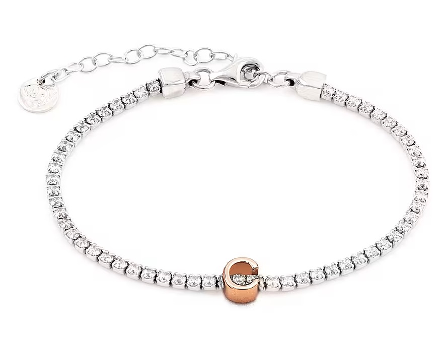 Bracciale in Argento 925/°°°, modello tennis di zirconi, iniziale C placcata oro rosa centrale. Lunghezza regolabile 15 – 19 cm.