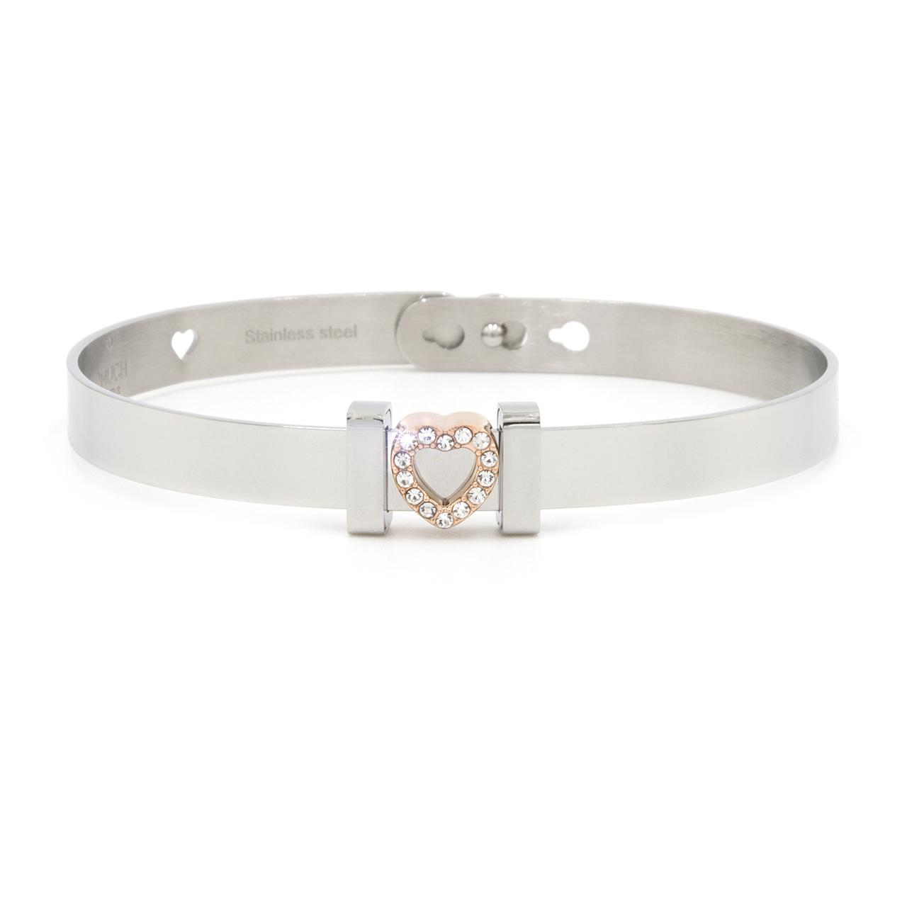 Bracciale in Acciaio lucido con stopper regolabili. Larghezza regolabile a tre posizioni. Personalizza il tuo bracciale, componi il tuo nome o inserisci uno o più simboli, rimuovendo e riposizionando lo stopper potrai sempre aggiungere i tuoi charms preferiti. Variante con charm cuore con cristalli rose gold, componibile in diversi colori. Con un sorriso hai preso il mio cuore ed è stato subito amore, il nostro legame non sarà vento saremo insieme in ogni momento. Indossa il tuo mood, 2much jewels, fatti col cuore Altezza bracciale 6 mm. Altezza lettere 9 mm. Diametro 5,5-6 cm. Garanzia, Confezione e Shopper bag Concessionari ufficiali Spedizione in 24 h.