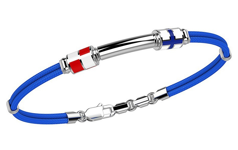Bracciale con piastra centrale in Argento 925, due Bandiere nautiche smaltate a mano su cilidri ai lati, inserti sui lati che tengono uniti il doppio filo di cordino nautico in kevlar Azzurro. Lunghezza regolabile da 18,5 a 21 cm, chiusura a moschettone.