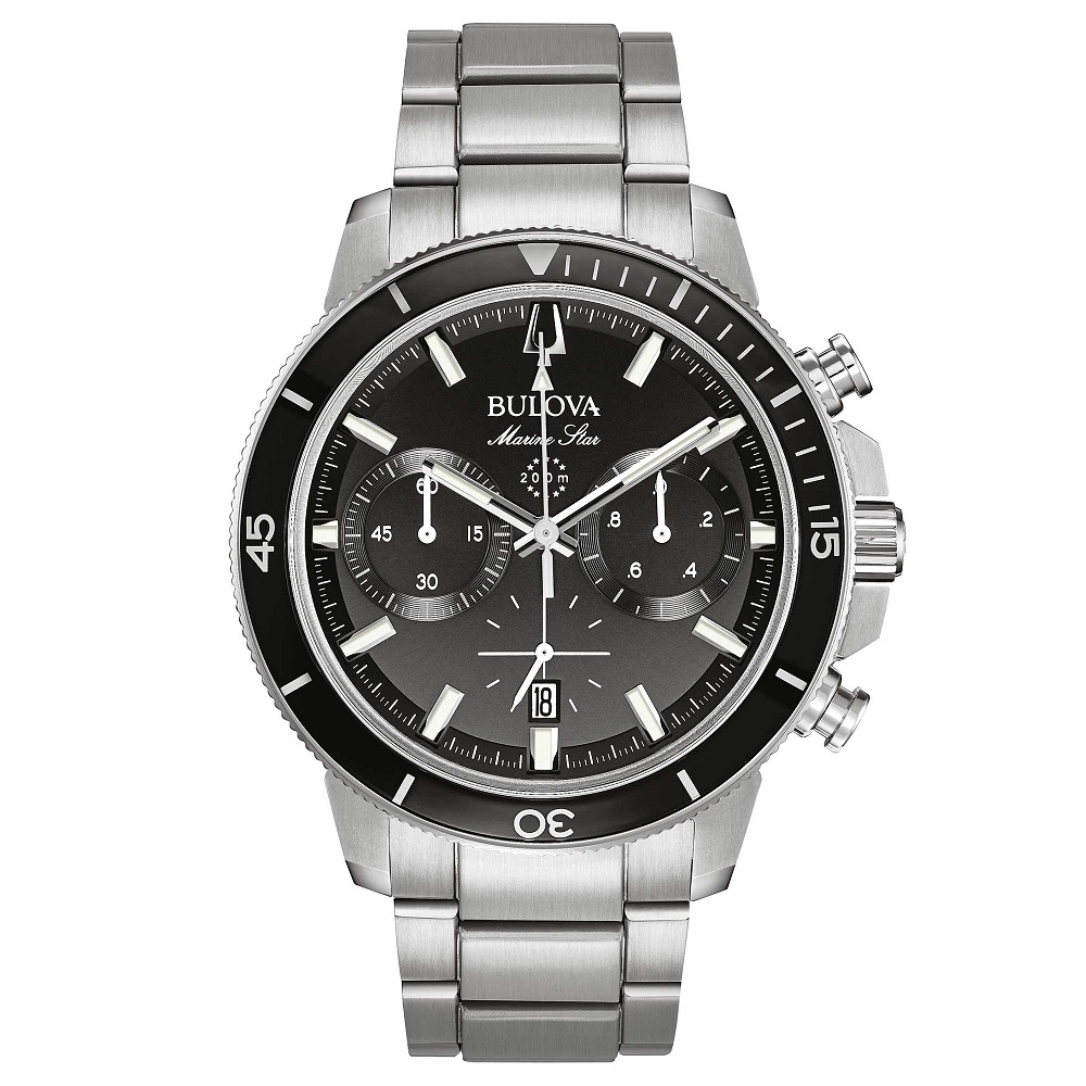 Orologio cronografo al quarzo, cassa in Acciaio inossidabile con dettagli ed inserto in vetro nero sulla lunetta girevole unidirezionale. dimensioni cassa 45 mm, spessore 14,3 mm. Quadrante nero, con lancette e indici luminosi, datario a ore 6 e funzione calendario, vetro minerale bombato, fondello a vite, impermeabilità 200 metri. Bracciale in acciaio con chiusura a deployante a doppia pressione e barra di sicurezza Garanzia 3 anni.