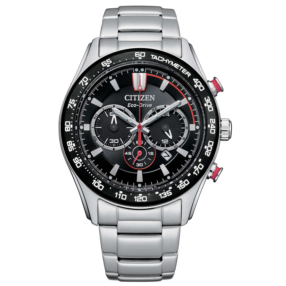 Orologio cronografo Sport per uomo, la cassa e il bracciale sono In acciaio con Diametro di 43 mm. Il Quadrante è nero con indici applicati, finiture di colore rosso ai pulsanti, alla sfera secondi e sul quadrante. Orologio impermeabile 10 Atm. Il Movimento è di tipo Eco -Drive con riserva di carica di 9 Mesi. Cronografo con scansione a 1/5 di secondo e fino a 60 minuti, funzione datario. Il vetro è di tipo minerale piano antiriflesso.