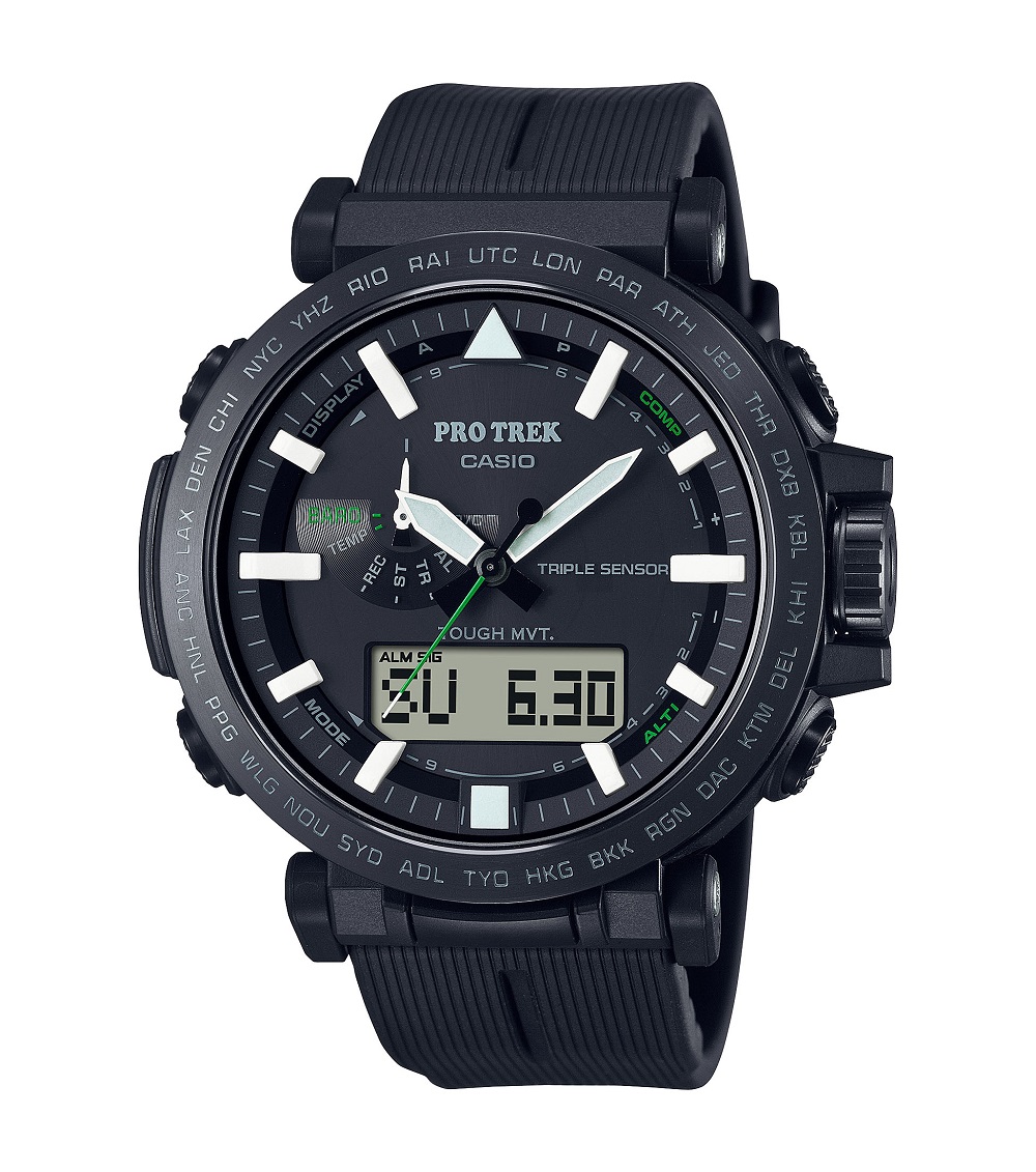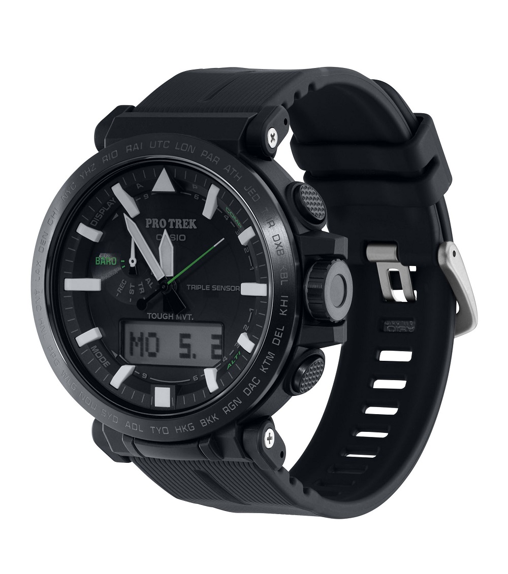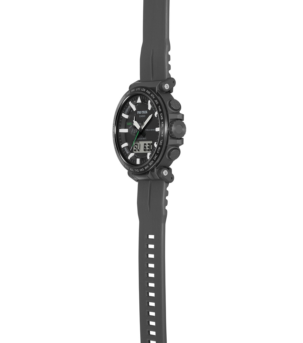 Pro Trek, orologio della collezione Casio con cassa i.p. nera e vetro minerale, sub 100 metri, cinturino gomma nero.