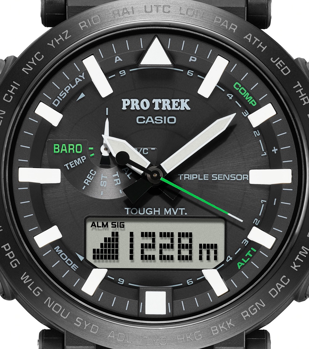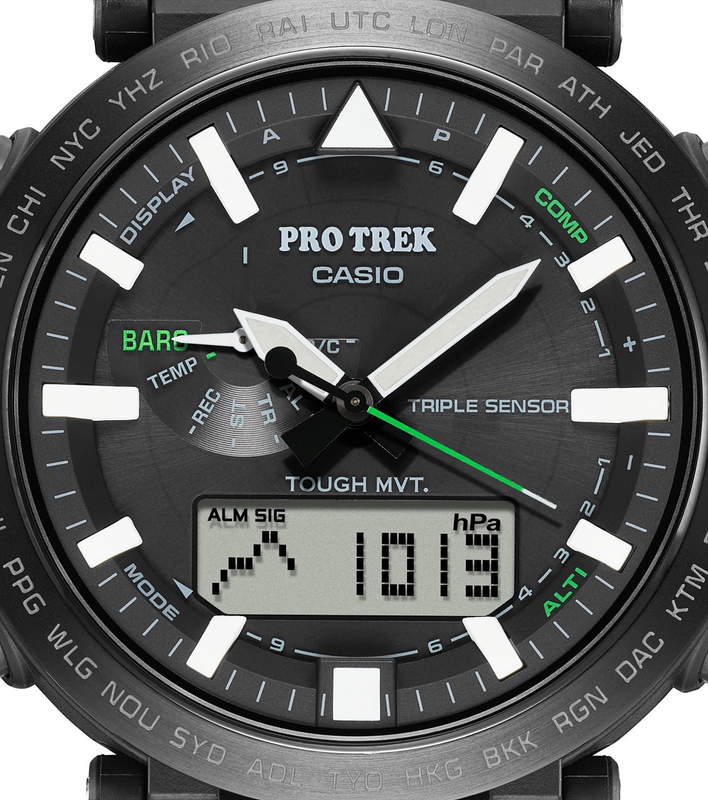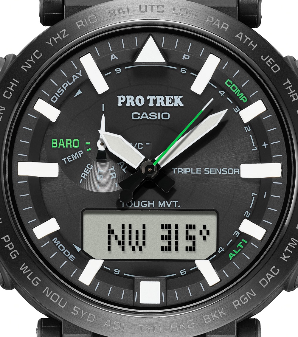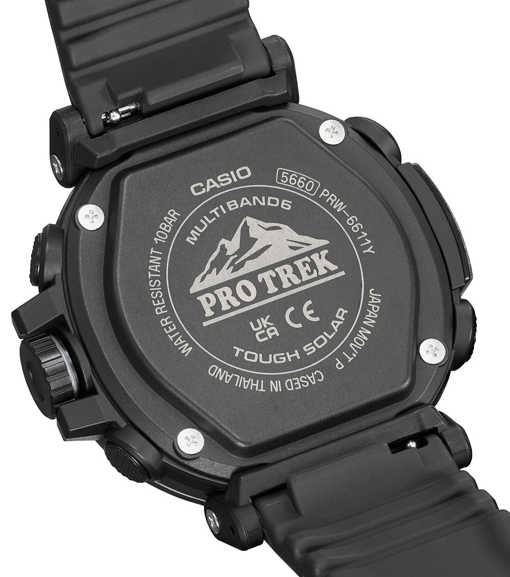 Pro Trek, orologio della collezione Casio con cassa i.p. nera e vetro minerale, sub 100 metri, cinturino gomma nero.