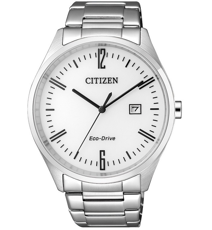 Orologio da uomo con cassa in acciaio, bracciale in acciao con chiusura deployante a pulsante, nuovo quadrante bianco in metallo con indici applicati, sfere e indici neri, movimento Eco Drive con riserva di carica 180 giorni, indicazione di ore, minuti, secondi e data. WR. Dimensione cassa 41,5 mm.