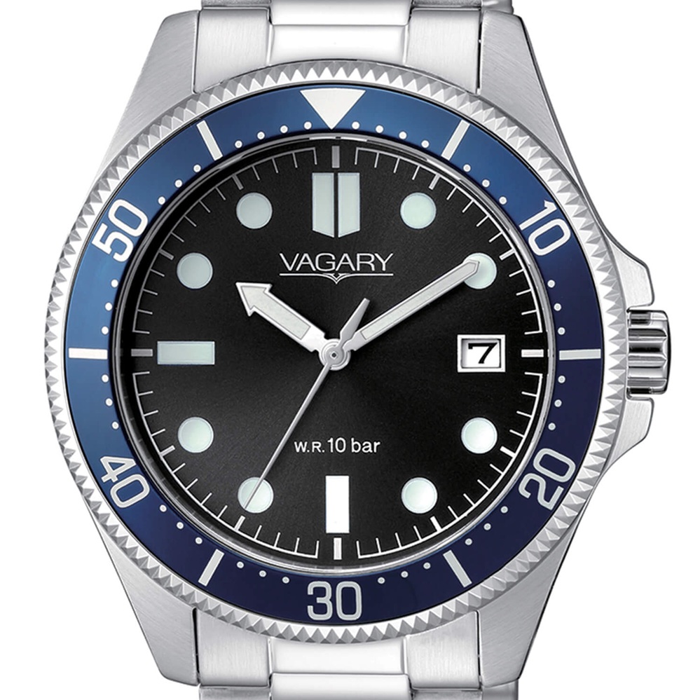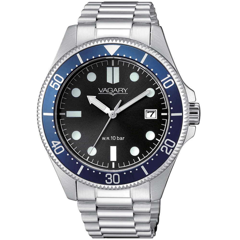 Orologio Solotempo da uomo di Vagary della collezione Aqua39. Modello con cassa in Acciaio con fondello serrato a vite, del diametro di 41 mm, resistenza all'acqua di 10 Atm. Quadrante Nero con indici, tre sfere e datario, Ghiera Blu e Vetro Minerale. Questo Orologio ha il bracciale integrato in acciaio e chiusura a pulsante. Movimento al Quarzo analogico.
