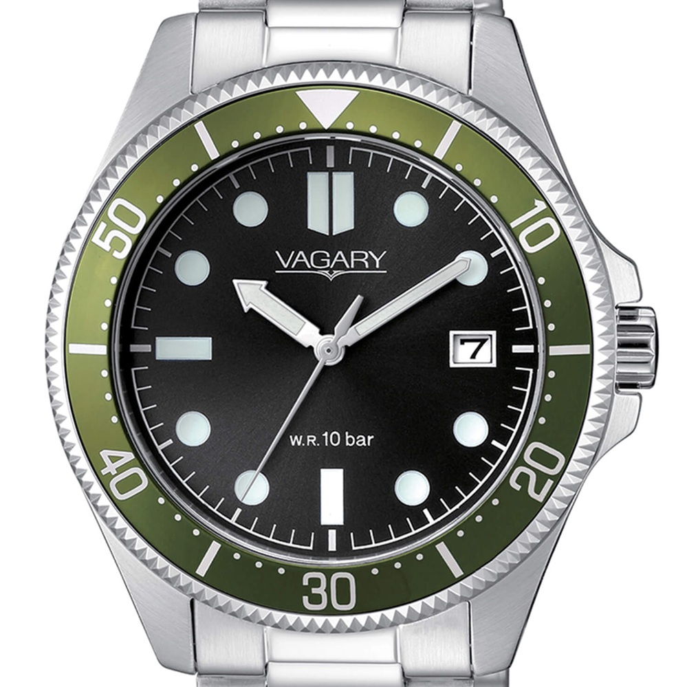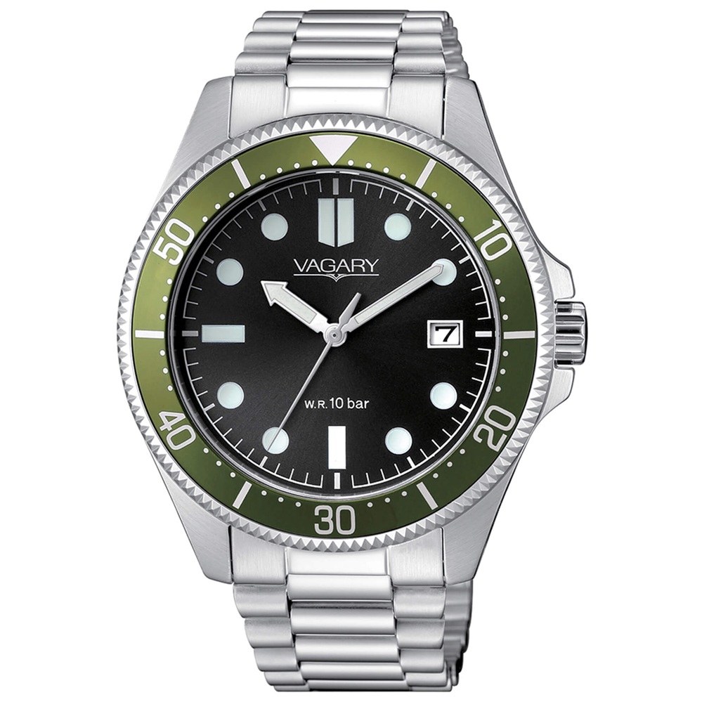 Orologio Solotempo da uomo di Vagary della collezione Aqua39. Modello con cassa in Acciaio con fondello serrato a vite, del diametro di 41 mm, resistenza all'acqua di 10 Atm. Quadrante Nero con indici, tre sfere e datario, Ghiera Verde e Vetro Minerale. Questo Orologio ha il bracciale integrato in acciaio e chiusura a pulsante. Movimento al Quarzo analogico.